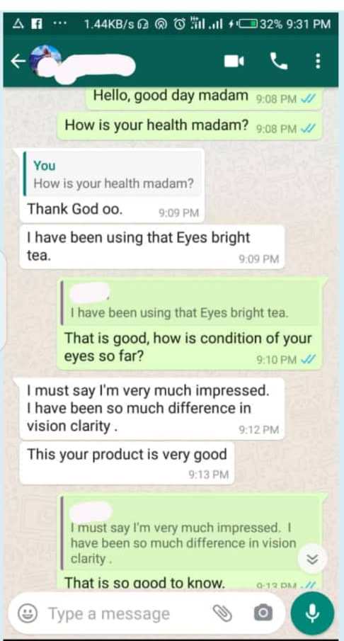 “My Father of 53 years old is currently using this product and it has been a wonderful experience seeing my father walk around the house without using a walking stick or someone holding her so as to show him the way. He could barely see before he started using this product. Now his eye sight is as bright as an eagle. No more constant drugs that does not actually work or constant use of eye drops”.